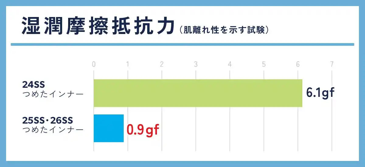 汗でぬれた際の生地の「肌離れ性」を示す数値(湿潤摩擦抵抗力)が、従来の6分の1以下に改善。汗をかいても、生地が肌にはりつきにくく、スッと離れるさらっとした着心地をキープします。 |