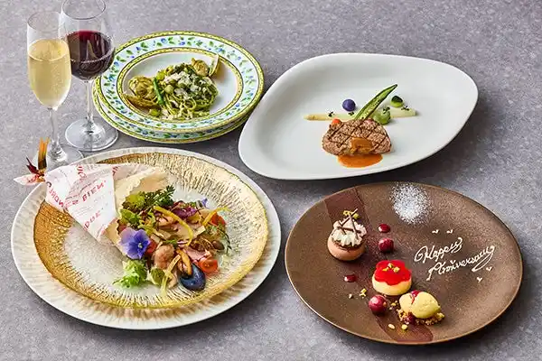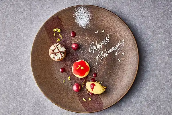 魚介をふんだんに使った花束を思わせる彩り豊かなオードブルをはじめ、香り高いバジルソースにあさりの凝縮した旨みを重ねたジェノベーゼパスタ、香ばしく焼き上げた牛肉の芳醇な旨みをコク深いグレイビーソースと合わせたサーロインのポワレ、そしてココア生地とグリオットチェリー、キルシュ、生クリームを使用したドイツ発祥の伝統菓子「フォレノワール」を小菓子のように一口サイズにして愛らしく盛り付けたデザートまで、全4品をご用意いたします。デザートプレートには大切な想いを乗せたメッセージを添えてご提供いたします。種類豊富なフリーフローを楽しみつつ、高層階から望むきらめく夜景に包まれながら、大切な記念日やお誕生日をお過ごしください。 |