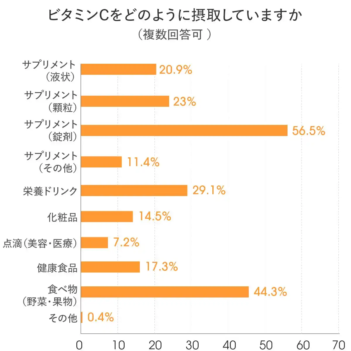 | 一方で、「食べ物(野菜・果物)(44.3%)」や「栄養ドリンク(29.1%)」も高い割合を占めており、ビタミンCは食事とサプリメントを軸に、さまざまな方法で取り入れられている実態がうかがえます。 | |||||||||