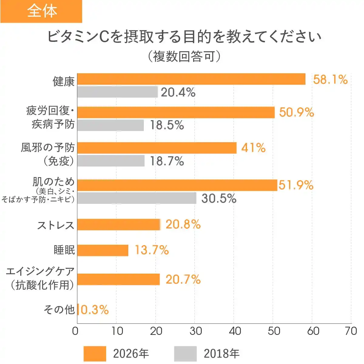 | ビタミンCを摂取する目的について、2018年調査では「美白」「シミ・そばかす対策」など、肌を中心とした美容目的が最上位でした。一方、2026年調査では、「健康維持(58.1%)」「疲労回復・疾病予防(50.9%)」「風邪予防(免疫)(41.0%)」がいずれも高い割合を示し、肌目的(51.9%)と並んで上位に位置しています。 | |||||||||