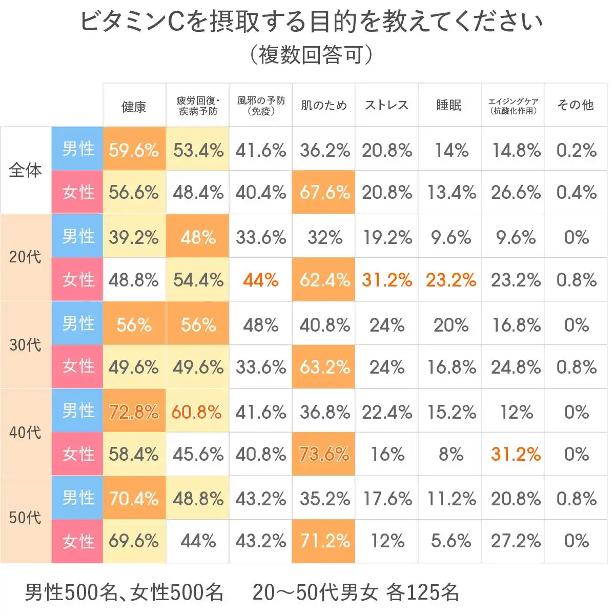 | この結果から、女性は美容を起点に複数の効果を期待し、男性は健康・実用面を重視する傾向がある一方で、免疫目的については男女ともに高く、ビタミンCが性別を問わず日常の健康対策として位置づけられていることが分かります。 | |||||||||