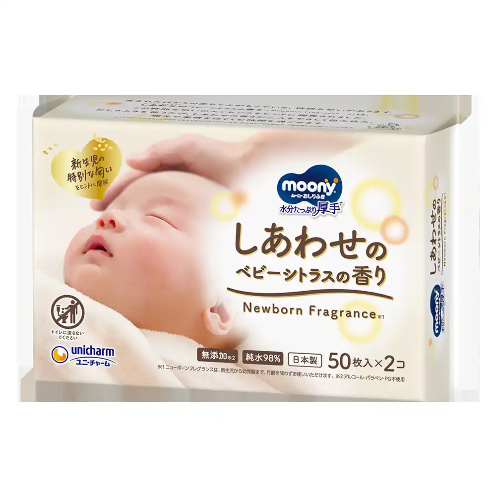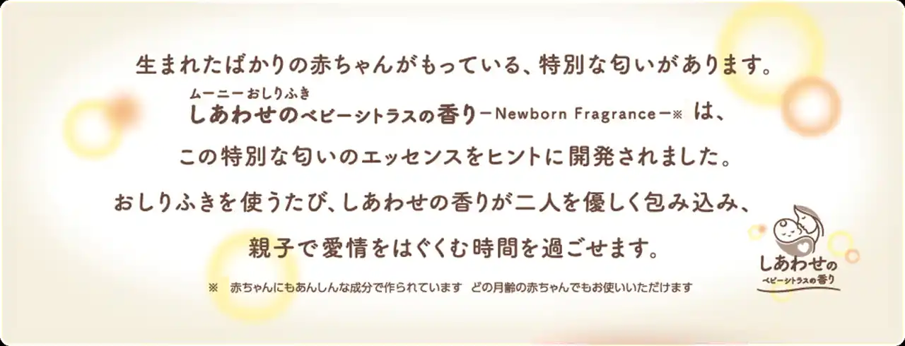 そこでこのたび、親子で愛情をはぐくむ時間をより豊かなものにすることを目指し、「新生児だけの特別な香り」を配合した『ムーニーおしりふき しあわせのベビーシトラスの香り』を、全国で発売します。 |