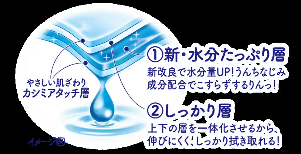 ・「新・水分たっぷり層」により、こすらずにやさしい拭き取りを実現します。 |