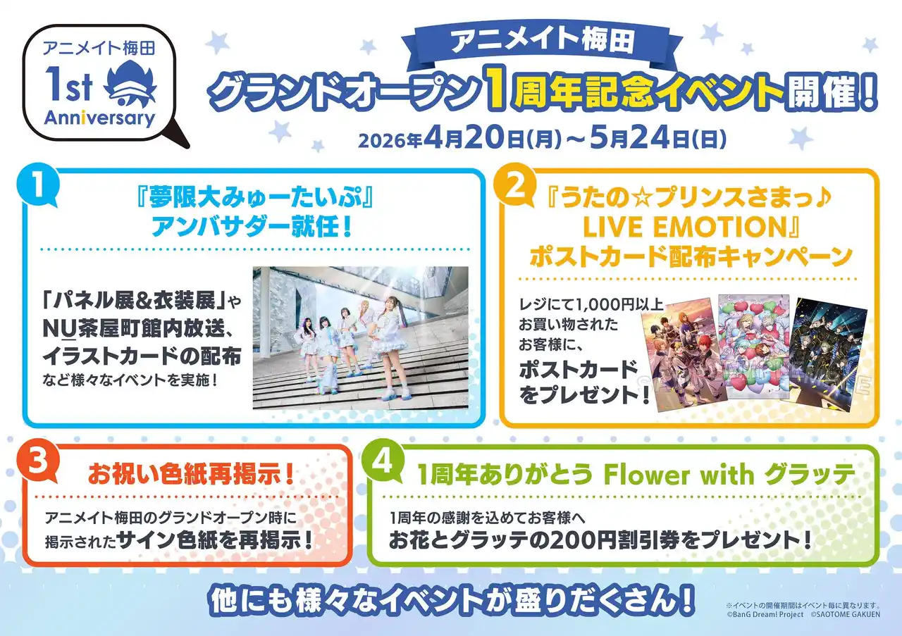 株式会社アニメイトは、「アニメイト梅田」のグランドオープン1周年を記念して、様々なイベントを実施いたします。 |