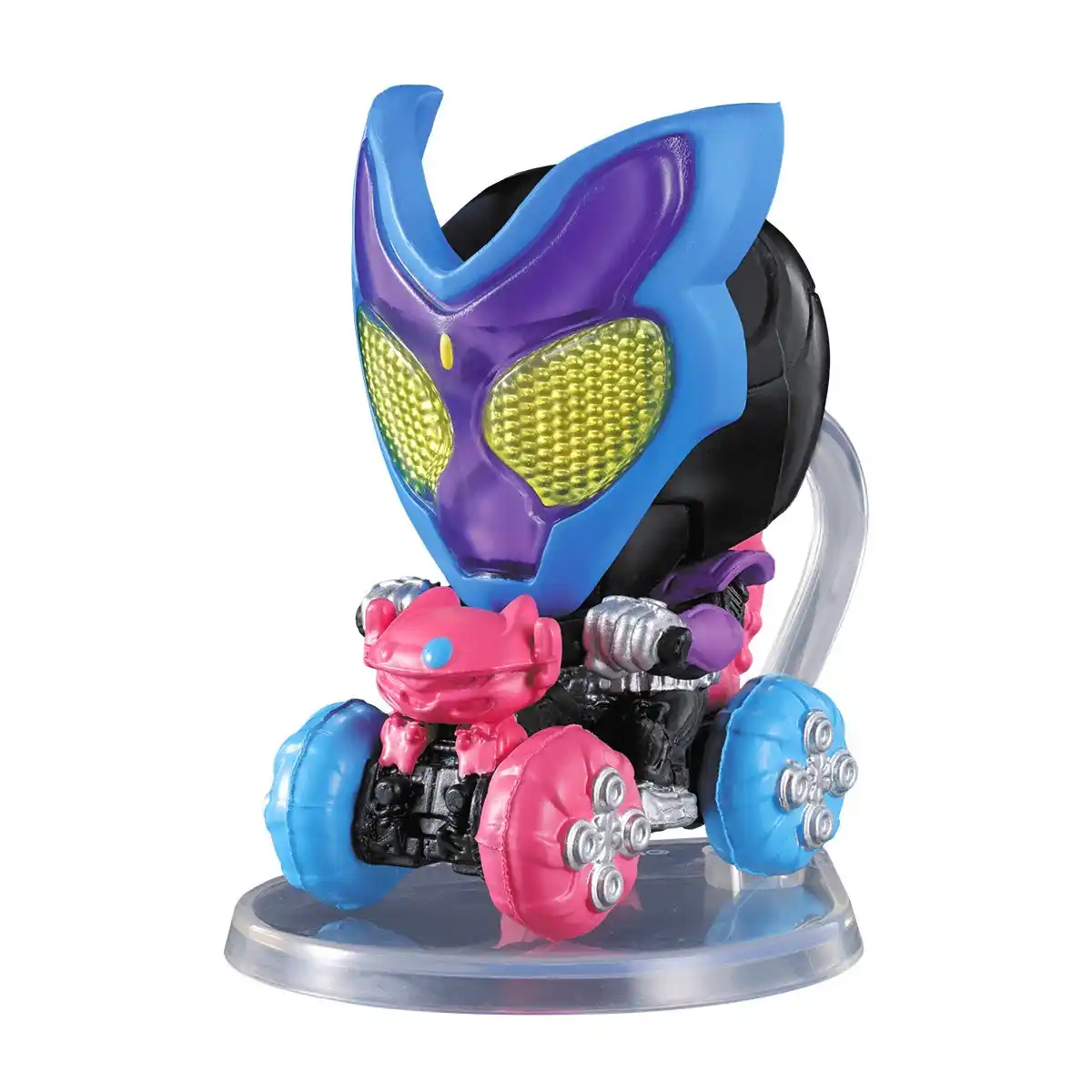 仮面ライダーのコレクションフィギュア「アクションライド」第5弾が登場!バイクに乗った仮面ライダーと専用台座がセットになっており、台座のボールジョイントにより「ウィリー」、「ドリフト」、「ジャンプ」などさまざまなライディングアクションが自由自在に楽しめる!さらに、マスクの複眼はクリア造形のハイクオリティ仕様! |
