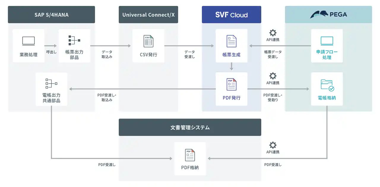 新たな基幹システムは2023年5月から運用を開始しました。現在では、会計コアであるSAP S/4HANAから出力される会計関連の帳票に加え、フロントエンドを担う Pega Platformから発行される請求書、見積書、発注書など各種報告書がすべてSVF Cloudを経由して出力されています。 これにより、クラウド上で統一された帳票基盤出力が整備され、大量出力やリアルタイム出力における優れた処理性能を確保でき、日々発生する多くの帳票が安定的に出力でき運用されています。 |