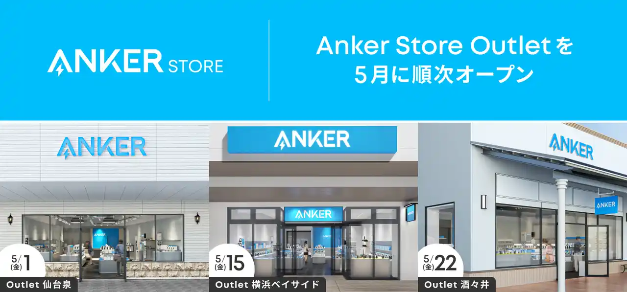 アンカー・ジャパン株式会社の子会社として常設直営店Anker Storeの運営事業を担うアンカー・ストア株式会社(本社:東京都港区、代表取締役CEO:猿渡 歩)は、2026年5月1日(金)に「Anker Store Outlet 仙台泉」、2026年5月15日(金)に「Anker Store Outlet 横浜ベイサイド」、2026年5月22日(金)に「Anker Store Outlet 酒々井」を順次オープンいたします。 |
