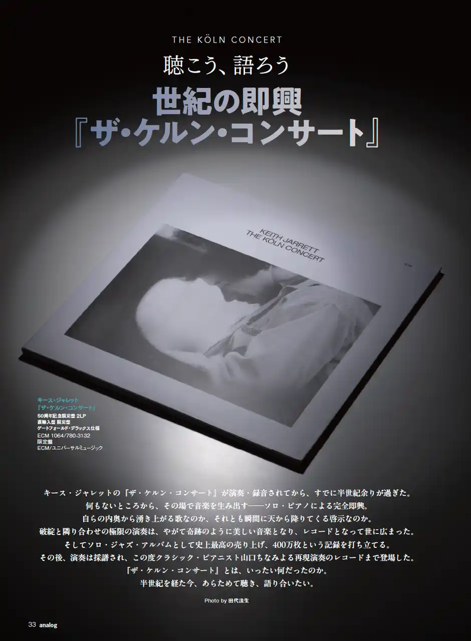 | キース・ジャレットの『ザ・ケルン・コンサート』から、半世紀あまりの時が流れました。何もないところから、その瞬間に生み出すソロ・ピアノの完全即興。それが奇跡のように美しい音楽となり、ソロ・ジャズ・アルバムとして史上最高の400万枚というセールスを記録しました。このたび、その演奏を採譜した譜面をもとに、クラシック・ピアニストの山口ちなみが再現作品をリリース。あらためて『ケルン・コンサート』に耳を傾けながら、この作品が私たちにとって何だったのか、そして「即興」とは何かについて、語り合いました。 | ||||||||||||||||||||||||||