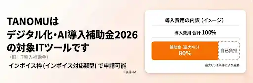 インボイス制度に対応した受発注ソフト・決済ソフト等の導入を支援する「インボイス枠(インボイス対応類型)」において、『TANOMU』導入にかかる費用が最大 4/5の補助率※でクラウド利用料が最大2年分支援されます。 |
