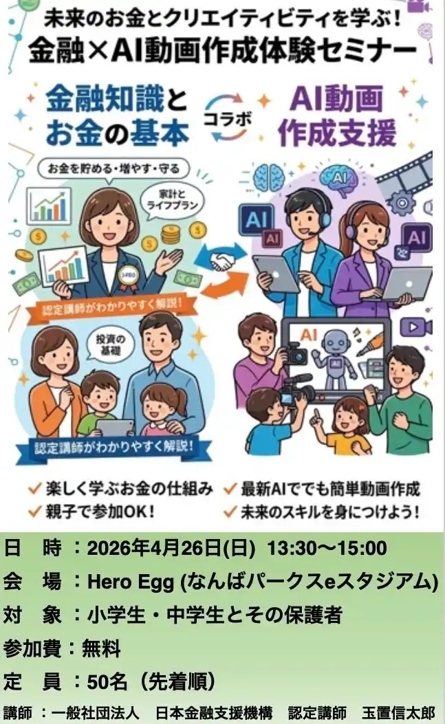 株式会社Meta Heroes(本社所在地:大阪府大阪市、代表取締役:松石和俊、以下「当社」)は、一般社団法人 日本金融支援機構の認定講師を招き、2026年4月26日(日)、なんばパークス内のDX教育施設「Hero Egg」にて、小・中学生とその保護者を対象とした「金融×AI動画作成体験セミナー」を無料開催いたします。 |
