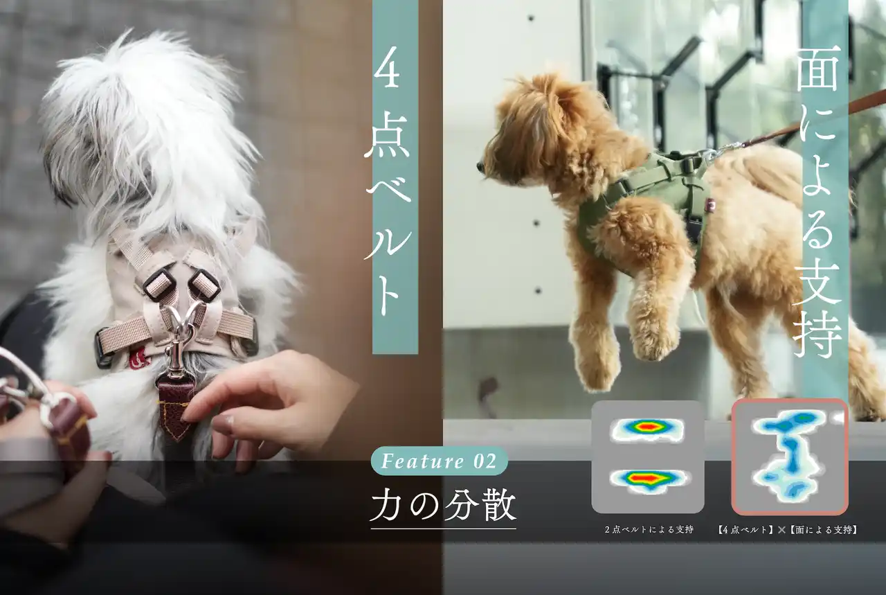 引っぱりで咳が出やすい子や、首の負荷に弱い子を想定して開発。特に小型犬は遺伝的に気管が弱い子が多いため、生涯、少しでも長くお散歩を楽しめるようにという想いを設計に込めました。 |