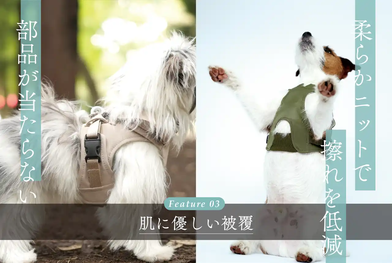 硬い部品が皮膚や被毛に当たらないようにすることで、皮膚の擦れや断毛を低減。引っ張らないといけない時に、部品が身体に食い込まない優しい設計です。また、腹部は柔らかいニット素材を採用することで、薄い皮膚の擦れを低減します。 |