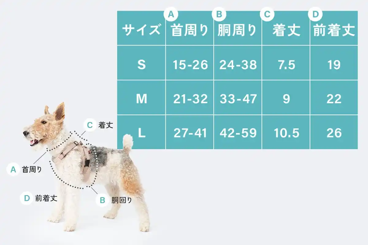 お腹深くまでカバーし、肋骨全体を覆うことで、後ずさりする子でもハーネスから抜けにくい設計になっています。 |