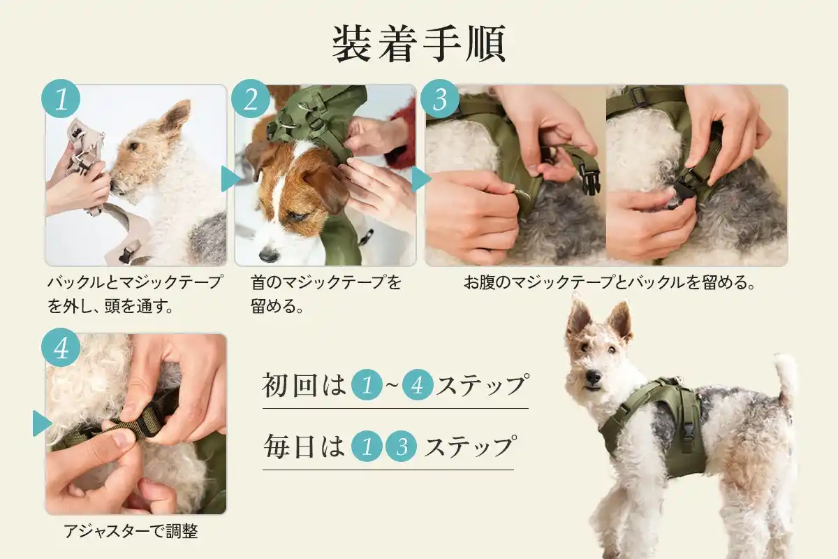 足を持たれるのが嫌い、じっとしているのが苦手、シニアで足が上げにくいーーー。そんな様々な個性を持つ子達にも装着しやすいように考えたハーネスです。「お散歩に連れていってあげたいのに、連れて行くまでが大変」。そんな飼い主さまの優しさと苦労に寄り添う設計です。 |