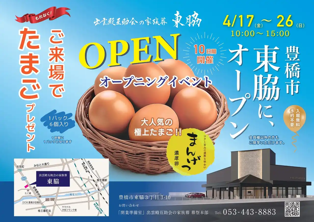 | 株式会社出雲殿互助会(所在地:浜松市中央区連尺町、代表取締役:岸本裕一郎)は、2026年4月17日、新たな家族葬ホール「出雲殿互助会の家族葬 東脇」をオープンいたします。 | |||||||||