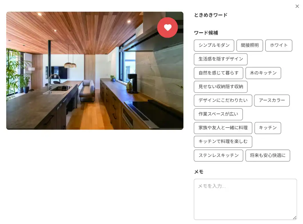 写真選択を通じて顧客の価値観を視覚的に引き出し、言葉にしにくい理想をその場で可視化します 。初回面談から「この会社は自分たちを分かってくれる」という強い納得感を生み出します。 |
