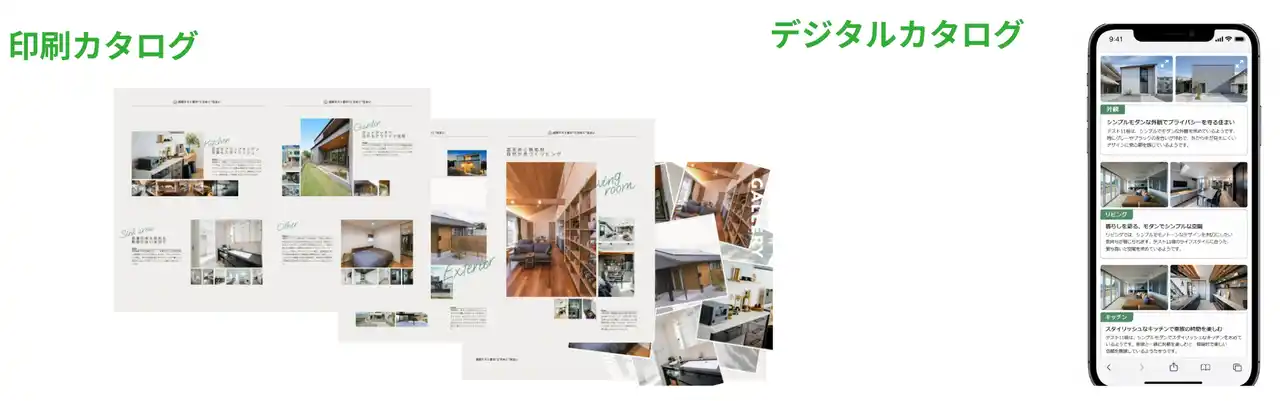 面談での検討内容を反映した「印刷カタログ」や「デジタルカタログ」を提供することで、帰宅後も繰り返し見返され、楽しかった打ち合わせの記憶が鮮明に蘇ります。さらに、家族内での会話や意見交換の中心となり、その積み重ねによって好感・信頼・志望度の向上につながります。 |