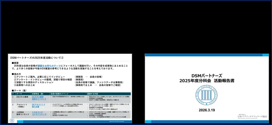 一般社団法人日本パブリックアフェアーズ協会(東京都港区、代表理事:増田寬也)が事務局を務めるDSMパートナーズは、2026年3月19日(木)に2025年度の活動報告会を開催し、企業や自治体におけるDXや人事を担当する方々にご参加いただきました。 |
