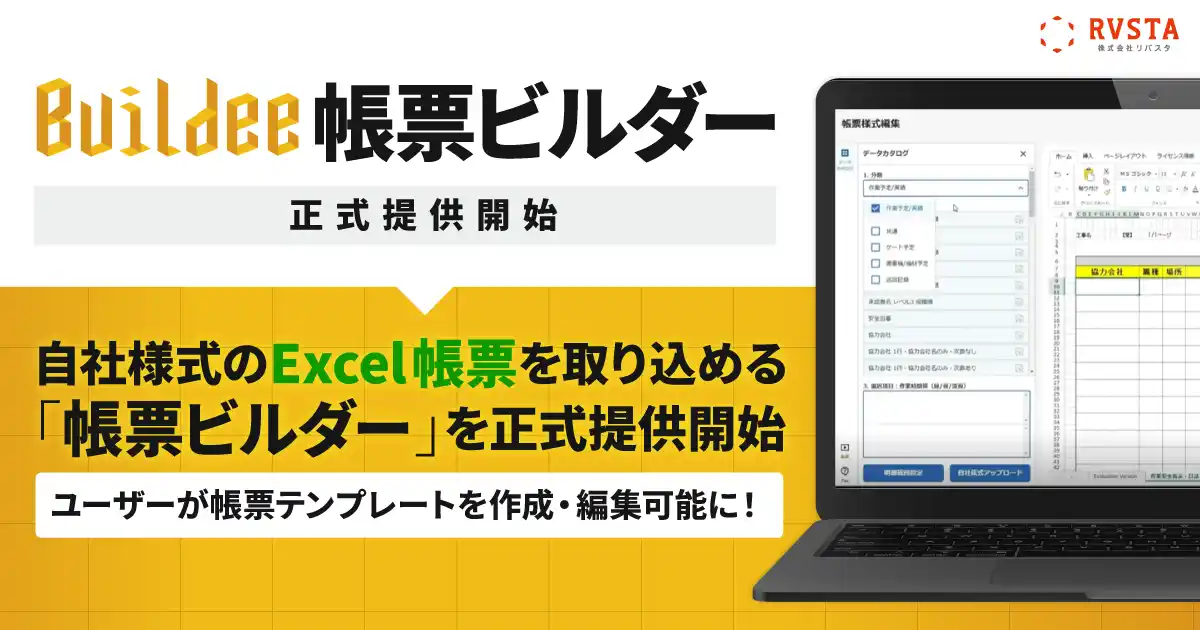 株式会社リバスタ(本社:東京都江東区、代表取締役:高橋巧、以下 当社)は、建設現場施工管理サービス「Buildee(ビルディー)」において、任意のExcel帳票を取り込み、データを紐づけて帳票テンプレートを作成・編集できるオプションサービス「帳票ビルダー(以下 本サービス)」の正式提供を2026年4月1日より開始しました。