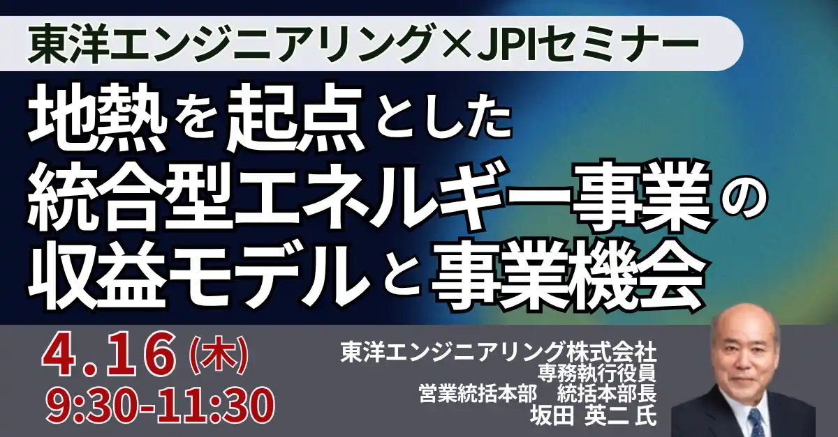 JPI(日本計画研究所)は、東洋エンジニアリング株式会社 専務執行役員 営業統括本部 統括本部長 坂田 英二 氏を招聘し、地熱を起点とした統合型エネルギー事業の収益モデルと事業機会について詳説いただくセミナーを開催します。 |