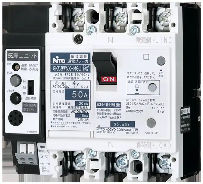 | 日東工業の感震ブレーカーは震度5強相当以上の揺れを感知すると、設定された時間(3分、1分、即時)経過後に自動的に遮断します。 | |||||||||