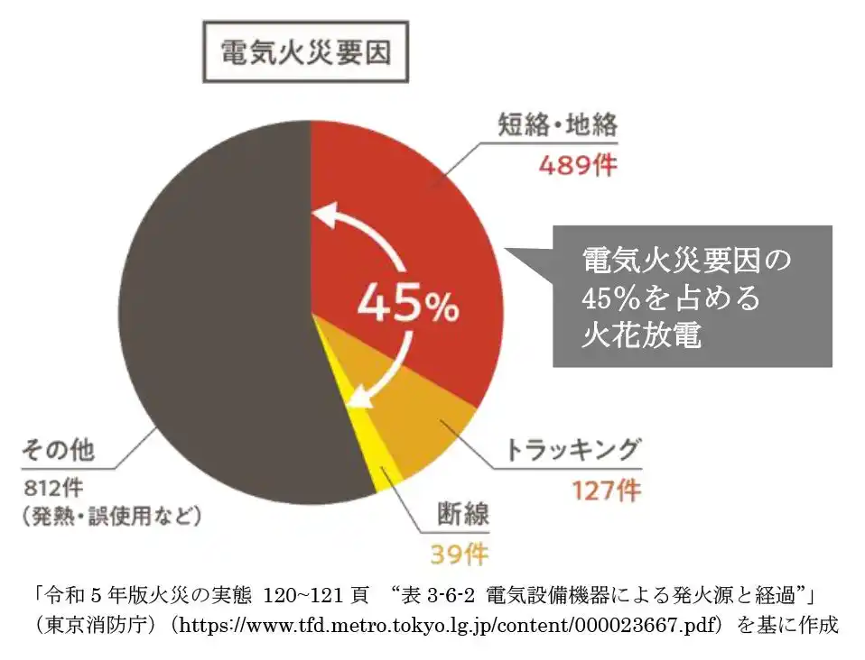 | 電気火災要因の約45%を占めるのは、トラッキング現象やケーブルの劣化・損傷に起因する「火花放電」です。従来からの保護機器である漏電ブレーカーは短絡・地絡や過電流が発生すると電気を遮断しますが、火災の原因となり得る火花放電の検出には対応していません。日東工業の「放電検出ユニット」は、この火花放電を早期に検出し、火災を未然に防ぐ日本初の画期的な商品です。 | |||||||||