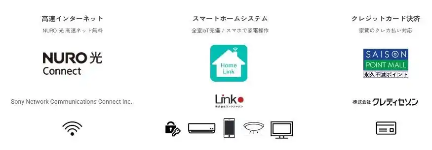 ※標準仕様となる主なサービス ・高速インターネット「NURO 光 Connect」(ソニーネットワークコミュニケーションズコネクト株式会社) ・スマートホームシステム(株式会社リンクジャパン) ・クレジットカード決済(株式会社クレディセゾン) |