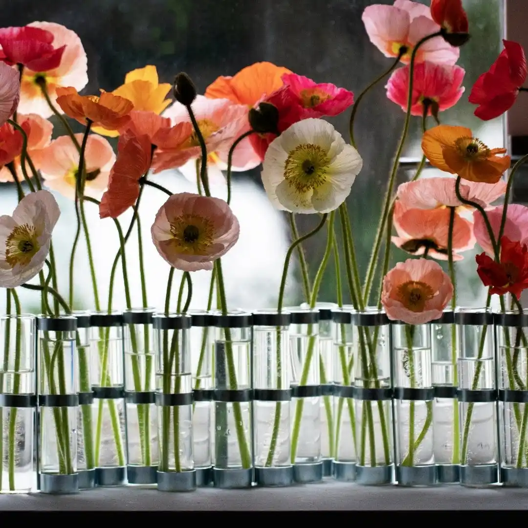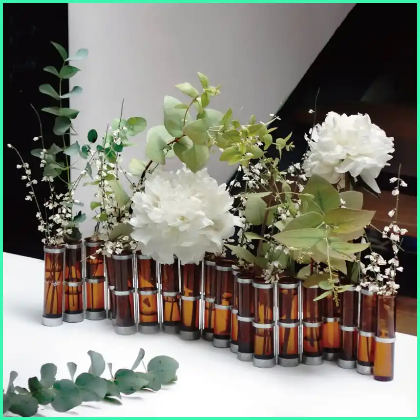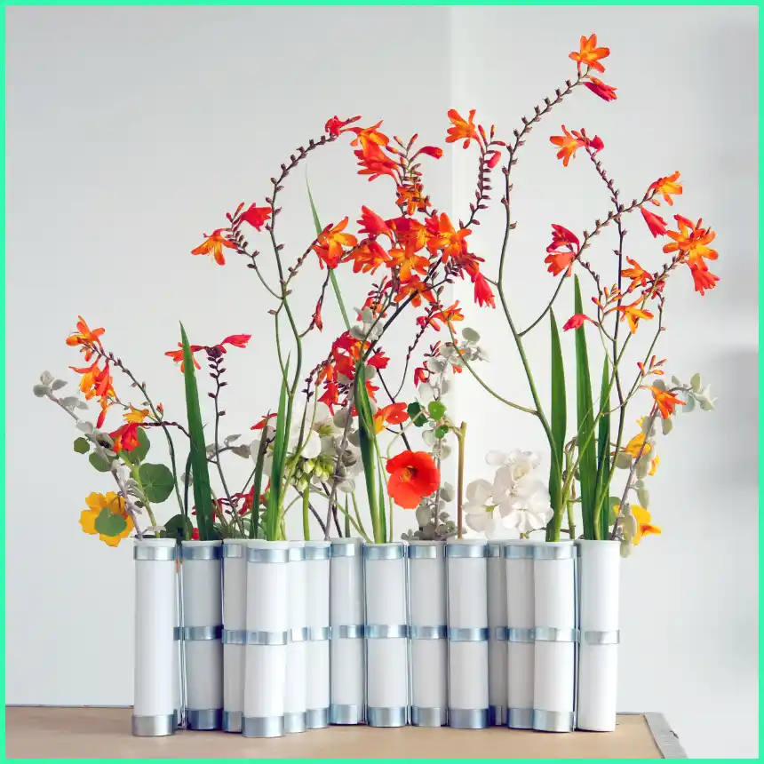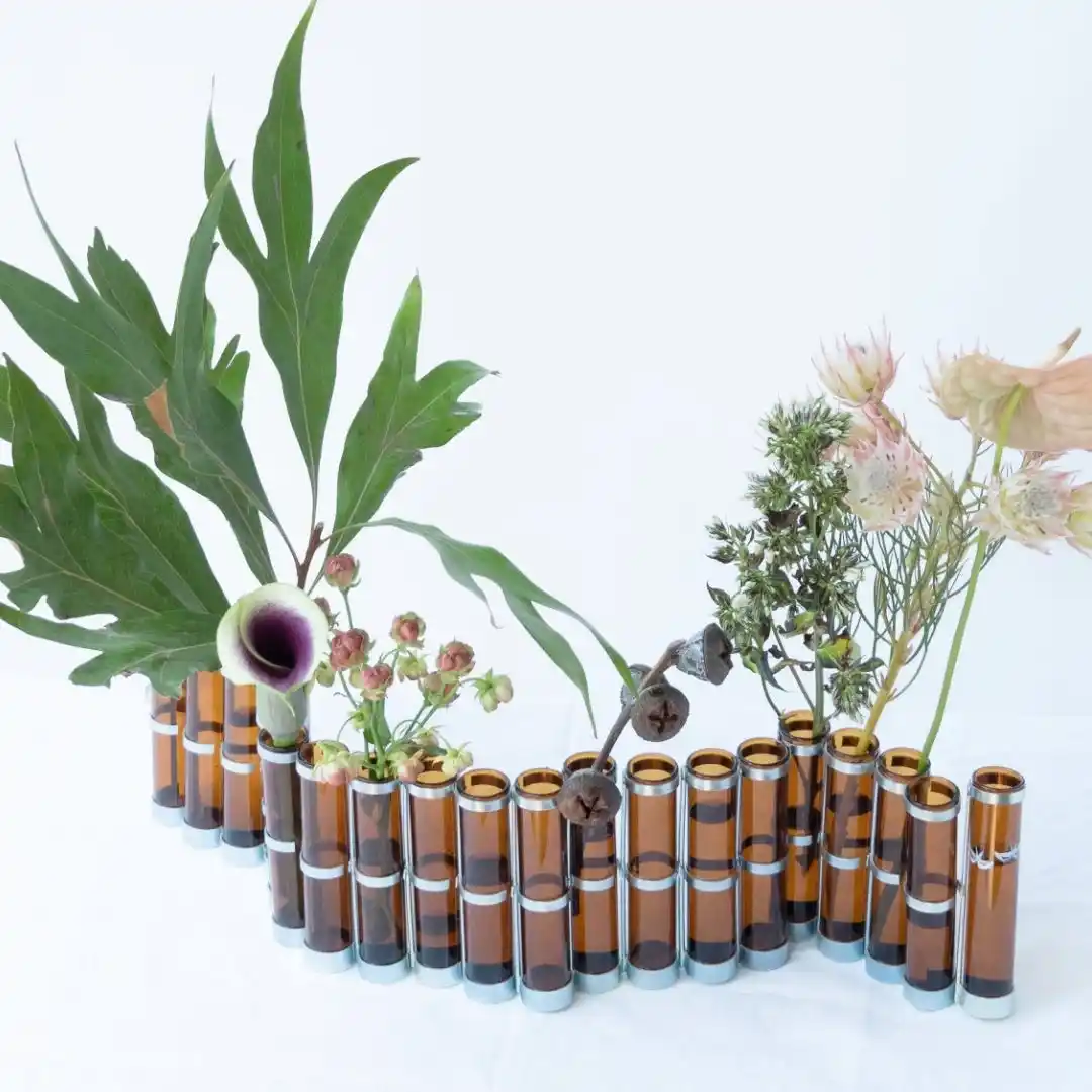 四月の花器は、変幻自在に形を変えます。 12~21本の花瓶が連結されていて、個性的な形をつくります。花が自然そのものであったことを忘れないのです。 |
