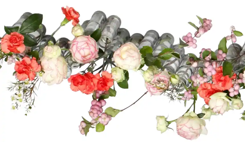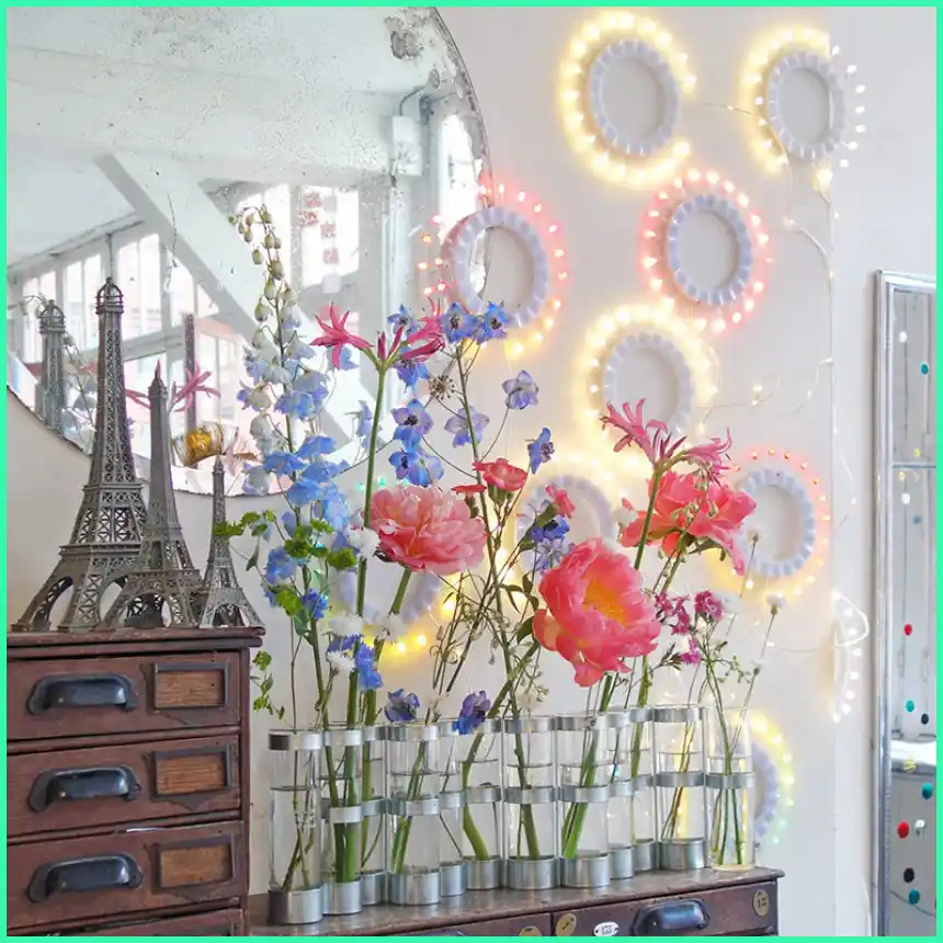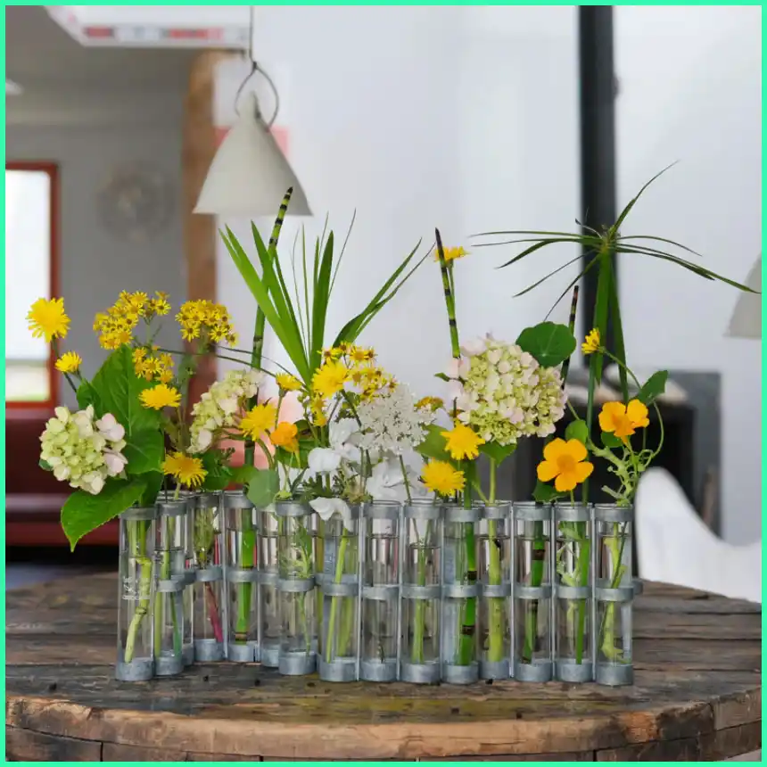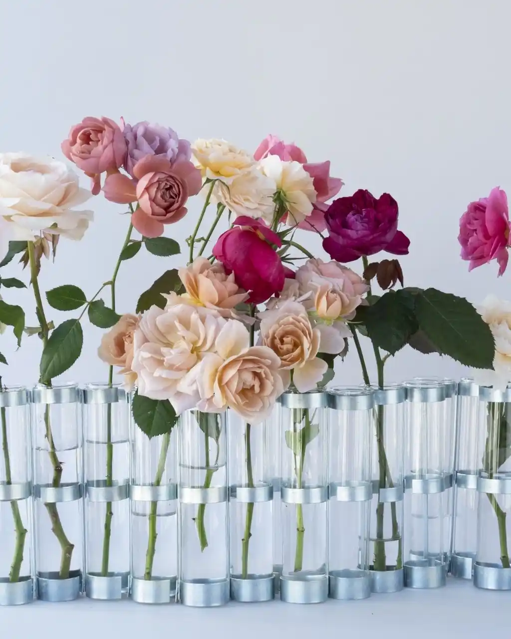 四月の花器は、変幻自在に形を変えます。 12~21本の花瓶が連結されていて、個性的な形をつくります。花が自然そのものであったことを忘れないのです。 |