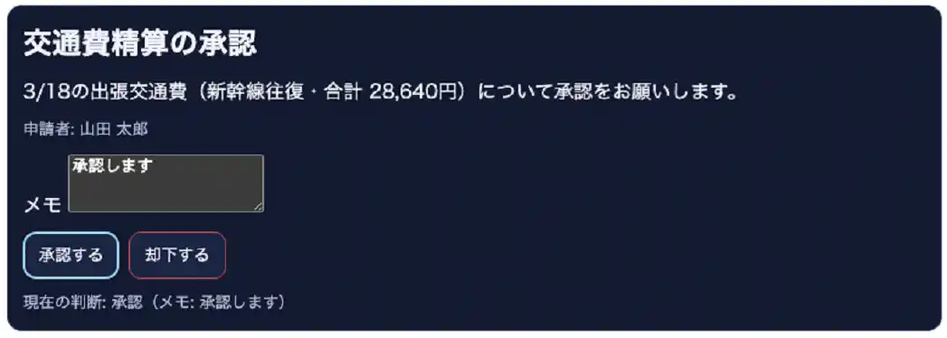 申請内容の確認から、理由などのコメント入力、[承認]または[却下]の操作まで、すべてチャット画面内で完結できます。別の画面を開く手間がありません。 |
