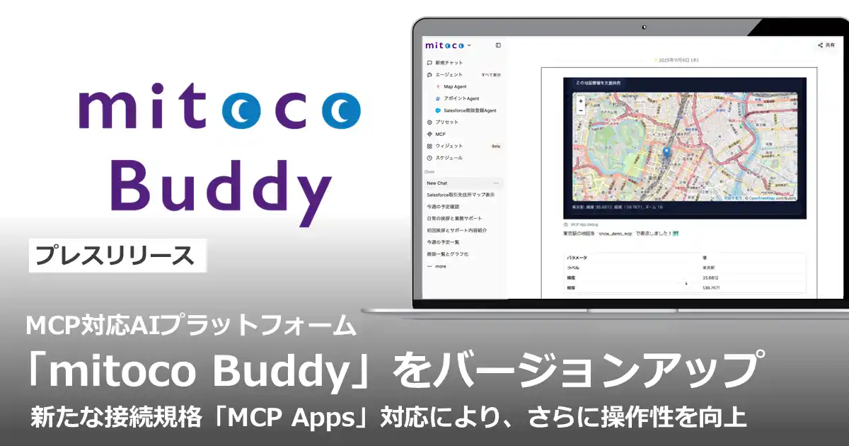 株式会社テラスカイ(本社:東京都中央区、代表取締役CEO 社長執行役員:佐藤 秀哉、以下「テラスカイ」)は2026年4月6日(月)に、MCP(Model Context Protocol)対応のAIプラットフォーム「mitoco Buddy」のバージョンアップを実施します。 |