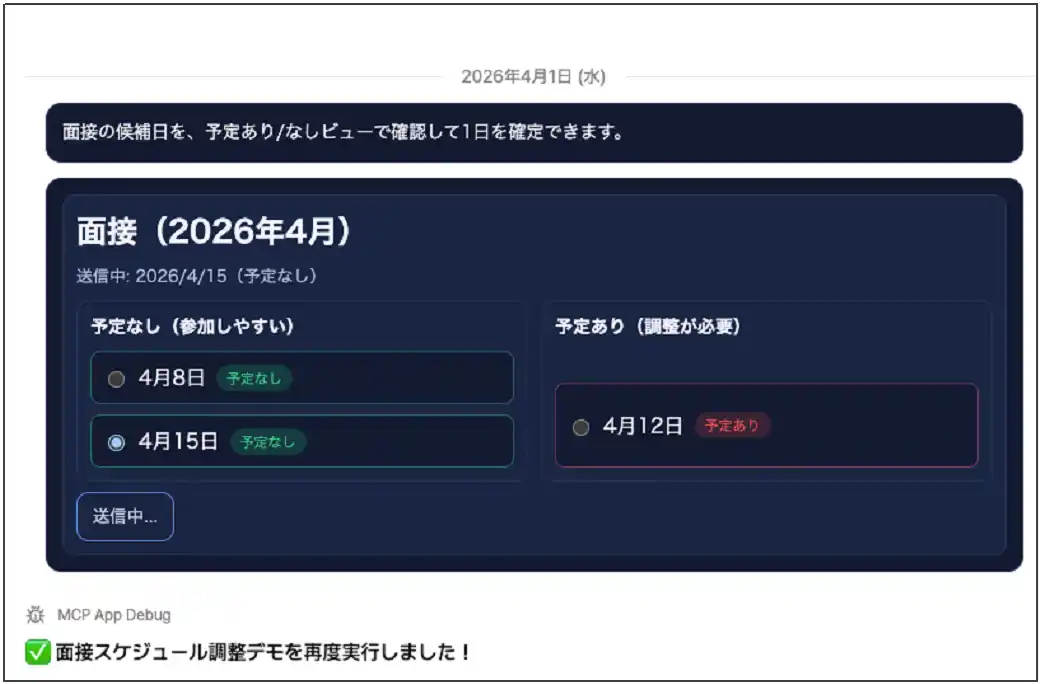 チャット上のボタン操作や入力が直接外部ツールへ反映されます。アプリを切り替える手間なく、会話の流れでスムーズに業務を完結できます。 |