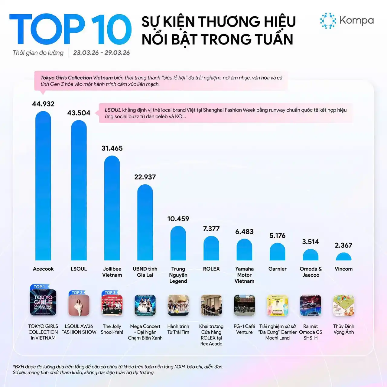 ベトナムのデータ分析機関「kompa.ai」が発表した週間イベントキーワードトレンドランキングにおいて、「TGC Vietnam」が堂々の1位を獲得。POPSが持つ数億人のフォロワーネットワークや、出演アーティスト・モデルによるSNS発信が相乗効果を生み、ベトナムのZ世代を中心に、今最も注目すべきカルチャーとしてその圧倒的な拡散力を証明しました。 |