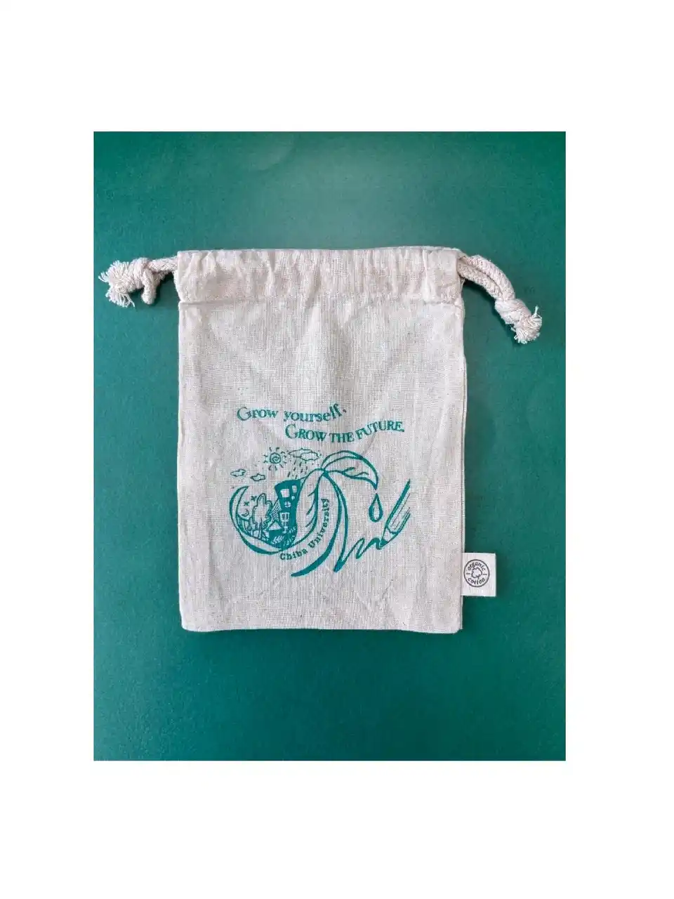 配布された巾着は、モバイルバッテリーや小物類が収まる使いやすいサイズで、素材には環境に配慮したオーガニックコットンを採用しております。デザインには、新入生を「若葉」に見立て、自然や生命、学びを象徴するモチーフを取り入れ、「Grow yourself, Grow the future.」というメッセージを通して、自身の成長と持続可能な社会の実現への意識が表現されております。なお、デザインは千葉大学法政経学部の学生が担当いたしました。 |
