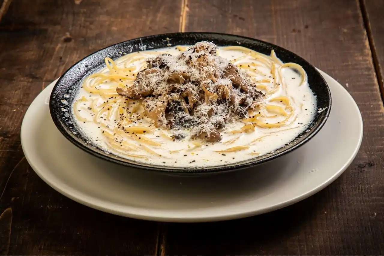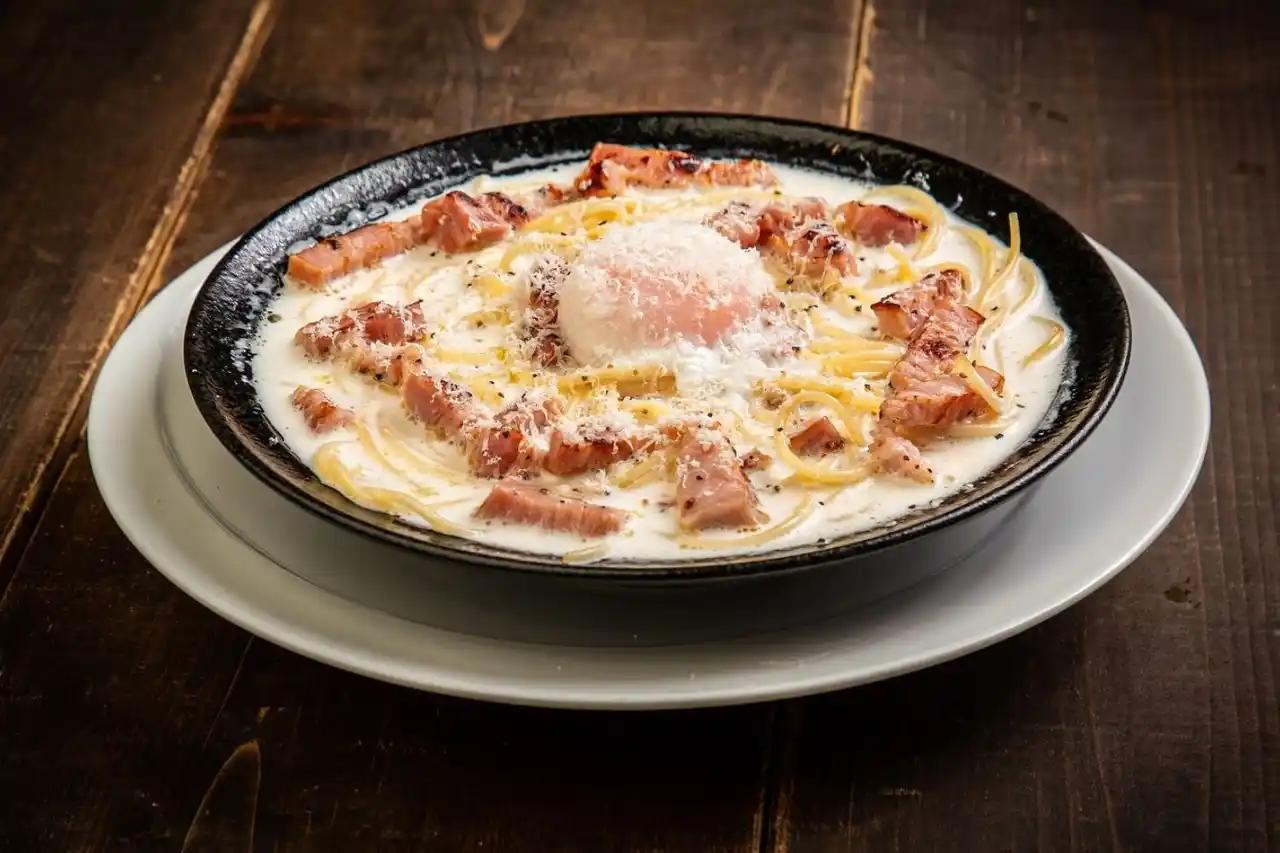どろっと黄身がとろける半熟卵とベーコン、胡椒のアクセントが聞いたカルボナーラ風! |
