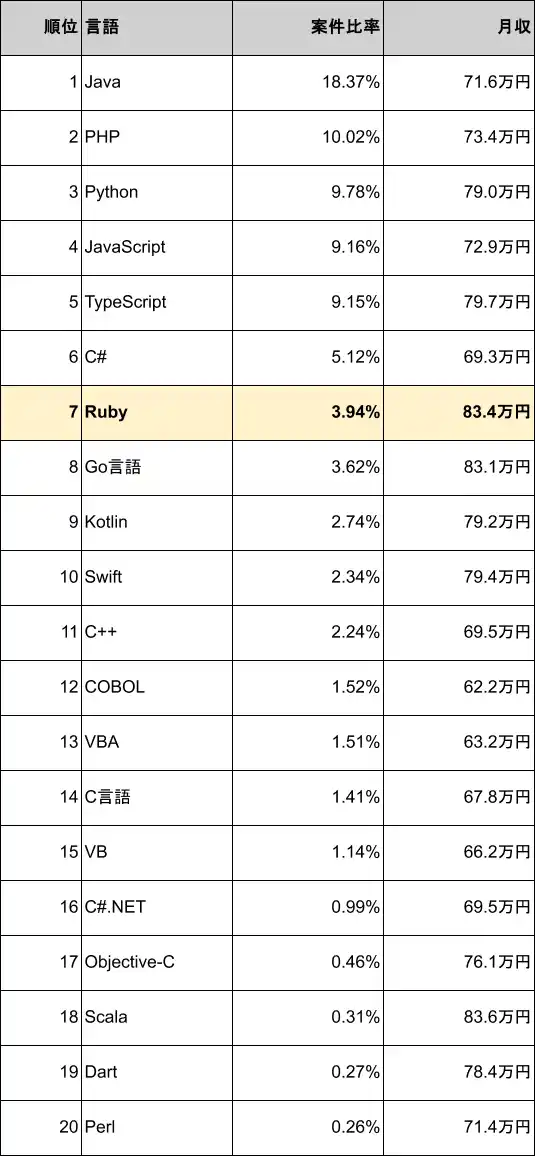 2026年4月時点でRubyの案件は市場全体の3.94%を占め、案件数は7位、平均月額単価は83.4万円と高い水準を維持しています。 |