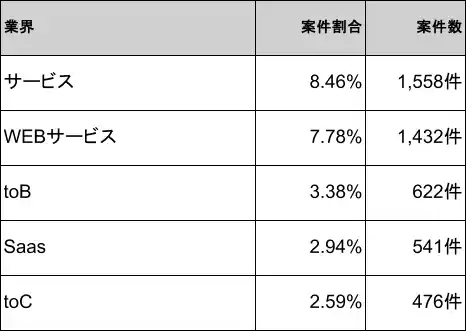 2026年4月時点のRuby案件は、サービスが8.46%(1,558件)で1位、WEBサービスが7.78%(1,432件)で2位、toBが3.38%(622件)で3位、SaaSが2.94%(541件)で4位、toCが2.59%(476件)で5位となり、上位5業界で全体の約25.2%を占めます。 |