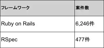 2026年4月時点のRubyフレームワーク別案件数では、1位がRuby on Railsで6,246件、2位がRSpecで477件です。 |