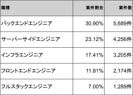 2026年4月時点のRuby案件の職種は、バックエンドエンジニア30.90%(5,689件)が最多、次いでサーバーサイドエンジニア23.12%(4,256件)、インフラエンジニア17.41%(3,205件)、フロントエンドエンジニア11.81%(2,174件)、フルスタックエンジニア7.00%(1,289件)です。 |