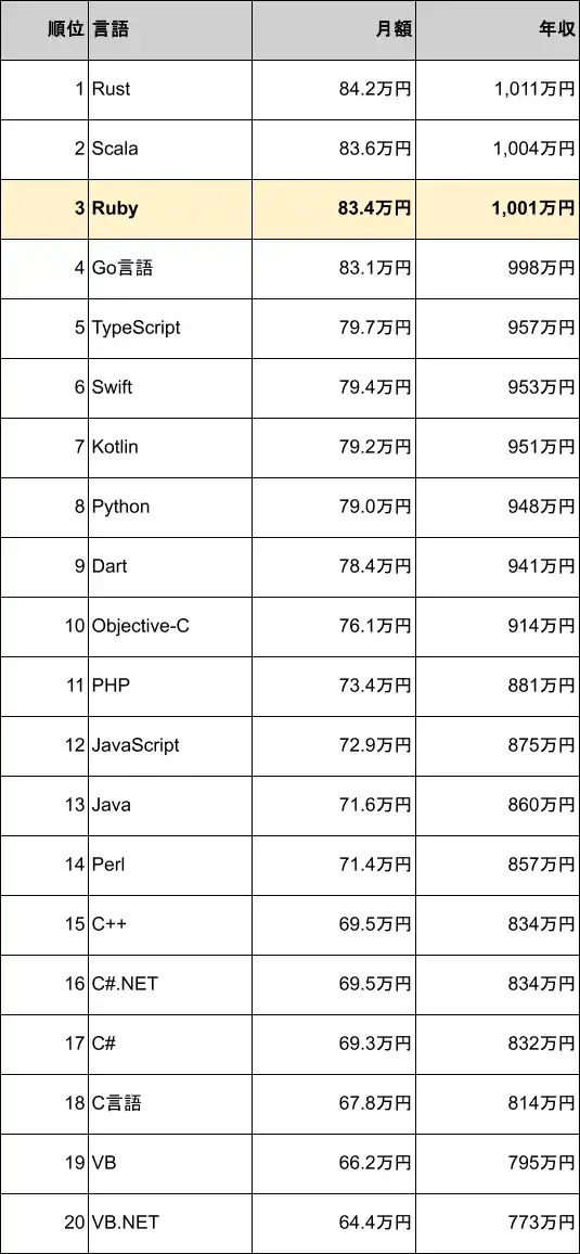 Ruby案件の平均月額単価は83.4万円、平均年収は1,001万円で、プログラミング言語別の年収ランキングでは3位に位置しています。 |