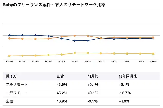 2026年4月時点のRuby向けフリーランス案件・求人におけるリモートワーク比率は、フルリモートが43.9%、一部リモートが45.2%、常駐が10.9%となっています。 |