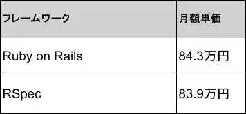2026年4月時点のRubyフレームワーク別の月額単価は、1位がRuby on Railsで84.3万円、2位がRSpecで83.9万円です。 |