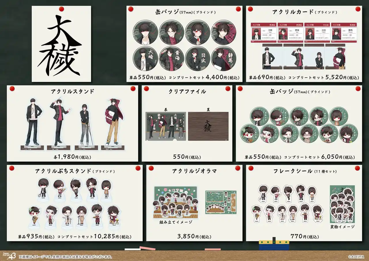 | 今回のグッズには“学園風ver.”の描き下ろし&ミニキャライラストが使用されており、大崎たちキャラクター11人が教員や生徒の姿で登場。購入特典も用意されていますので、ぜひこの機会にチェックしてみてください! | |||||||||