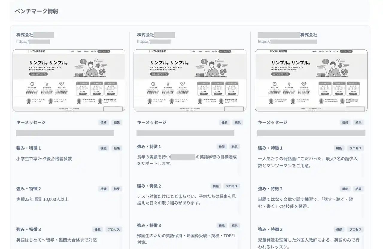 競合LPや広告表現を比較・分析することで、クリエイティブ制作を感覚や経験だけに依存させず、根拠ある訴求設計を支援します。 |