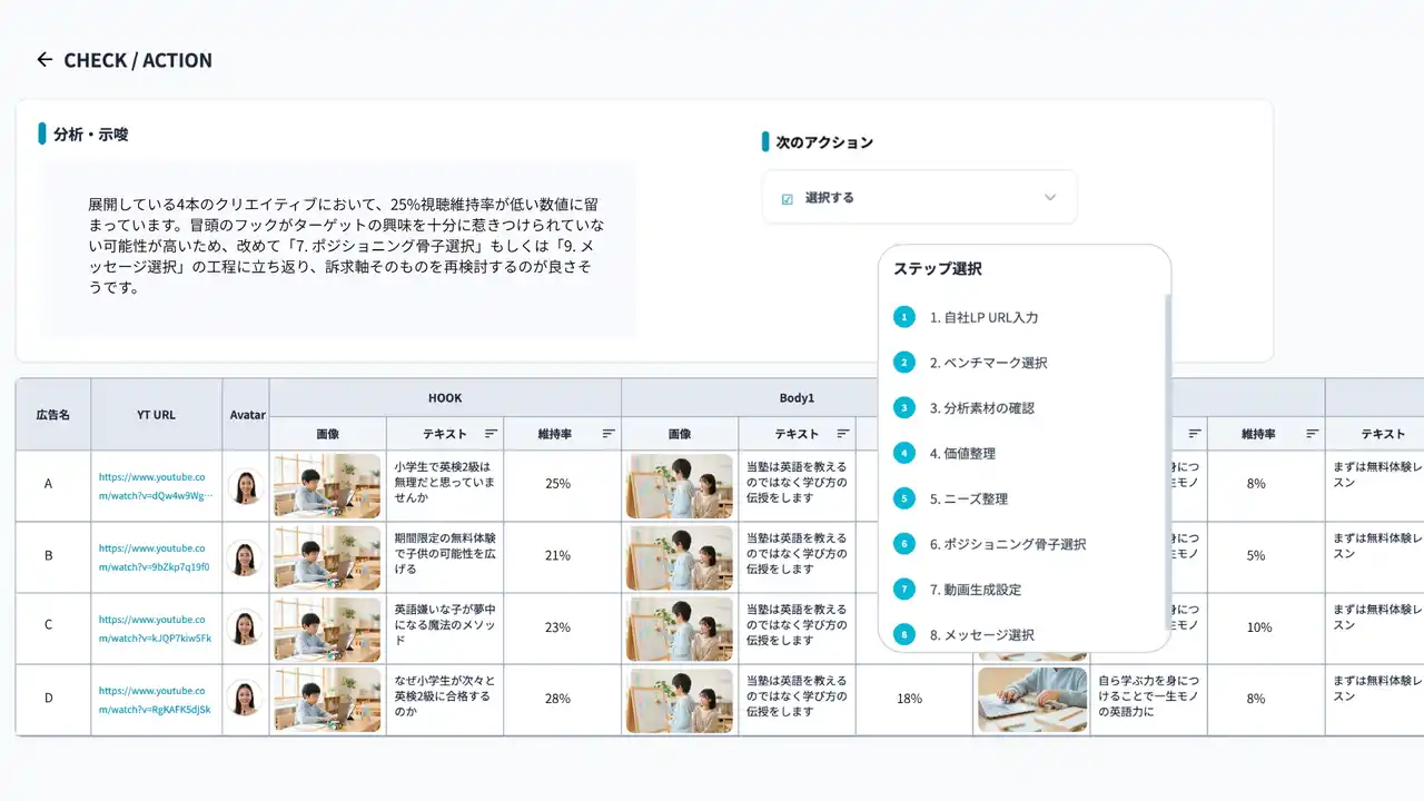 HookHackは、競合LPや広告表現のリサーチ、他社分析を起点とした複数パターンの訴求軸生成、広告運用における仮説検証を通じて、動画広告におけるインプットとアウトプットの関係を可視化し、売上差分創出につながる意思決定の再現性向上を支援します。 |