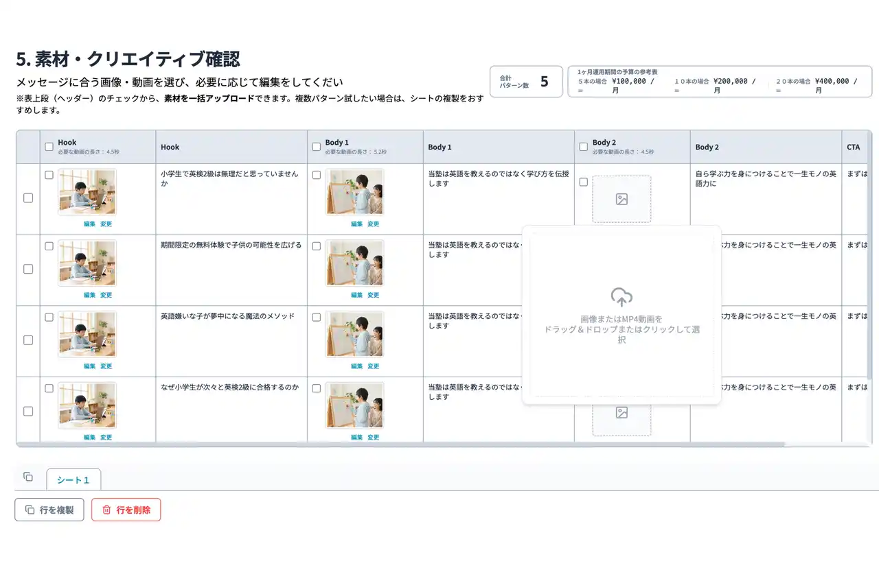 LPを起点に、選択肢を選ぶだけで複数の動画パターンを生成。仮説ごとのパターンを素早く用意することで、テスト速度の向上に貢献します。 |