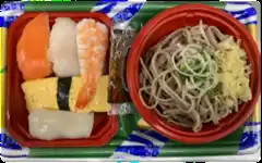 丼ぶり・そばセットの新商品です。人気のサーモン・あぶらガレイ・えび・いか・玉子のにぎり寿司5カンと、風味豊かな信州そばを組み合わせたセットをラインナップに加えました。旧商品より1カン増量し、お得感の増した寿司弁当です。 |
