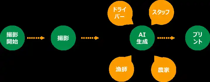 顔写真を撮影し、サービスを支えるさまざまな職種の人々に「へんしん」できる体験型フォトコンテンツ。AI画像生成技術により、グリーンビーンズを支える多彩な人物に変身したイラストがその場で完成します。 |