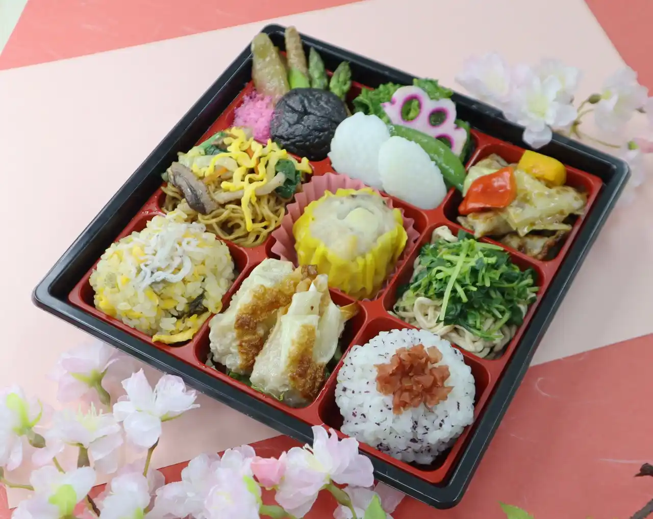 春キャベツの回鍋肉や豆苗干し豆腐和え、ちりめんじゃこ高菜炒飯など春が旬の食材をメインにした中華幕の内弁当です。 |