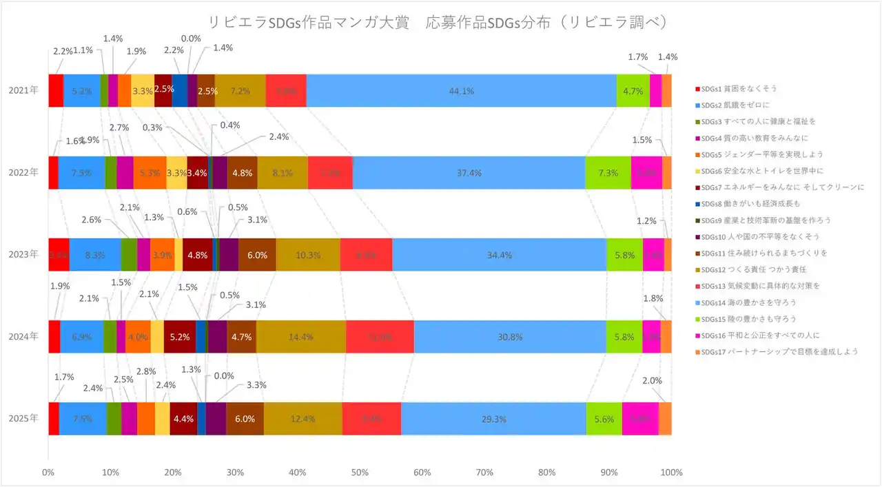 | 「リビエラSDGs作品マンガ大賞」には、これまで4歳から88歳までという極めて幅広い世代から、累計4,500点を超える情熱的な作品が寄せられてきました。応募作品のSDGs番号の分布推移を紐解くと、それぞれの年齢や立場で刻々と変化する社会を見つめ、「今、伝えたいこと」を形にしてきた軌跡が浮き彫りとなります。 | ||||||||||||||